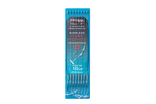 Perfektně vázané method feederové montáže s použitím silných a spolehlivých háčků Carp Method vázaných na 4”/10 cm monofilu. Pushstopy jsou rychlou a efektivní volbou pro montáž návnad, jako jsou luncheon meat, vrtané pelety, mini boilies, kukuřice a dokonce i červi. 4” háčkové destičky udržují montáže v mírném napětí, takže jsou perfektně rovné a připravené k použití bez jakýchkoli zkroucení. Destičky lze buď ponechat tak, jak jsou, uložit do Drennan Hook Book, nebo je přenést do 4” Hook Box nebo 6” Hook Box pomocí přiložených samolepek, které umožňují snadnou identifikaci každého typu. Dostupné varianty: Velikost 8 vázaná na 10 lb (0,24 mm) Velikost 10 vázaná na 10 lb (0,24 mm) Velikost 12 vázaná na 8 lb (0,22 mm) Velikost 14 vázaná na 7 lb (0,20 mm) Velikost 16 vázaná na 6 lb (0,18 mm) Vlastnosti: Délka 4” 10 cm 8 návazců na destičce Dokonale rovné montáže pro method feeder Silné háčky pro method feeder Extra odolný monofilament Pushstop hair rigs Kompatibilní s 4” a 6” Hook Boxy