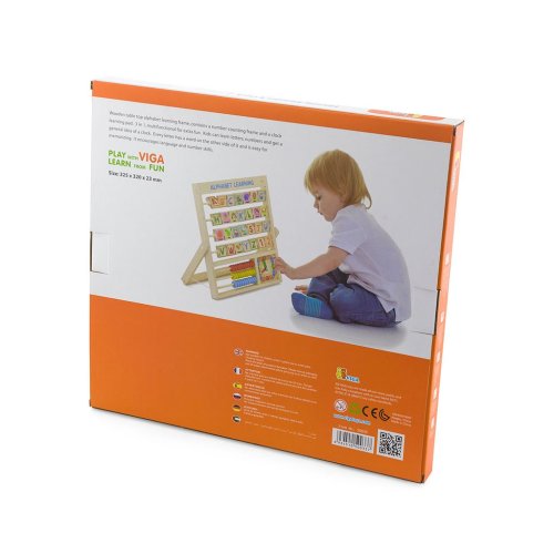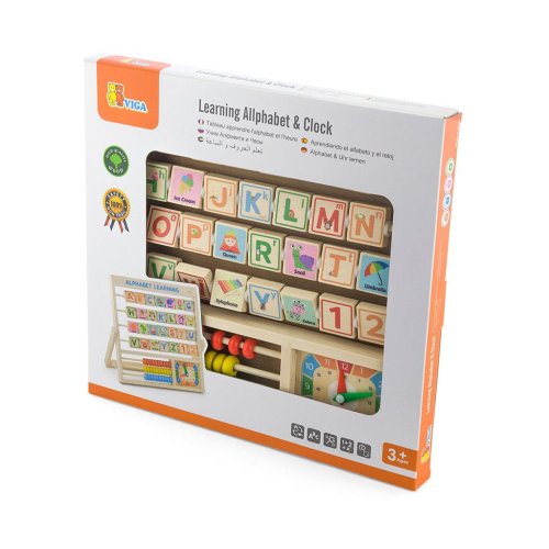 Deska připomínající počítadlo s kostkami abecedy. Každá z kostek abecedy má na zadní straně obrázek odpovídající písmenu v angličtině. Ve spodní desce hračky je umístěno malé počítadlo, na kterém se dítě naučí počítat, sčítat a odčítat do 30. Vedle počítadla jsou hodiny - ideální pro výuku čtení času.