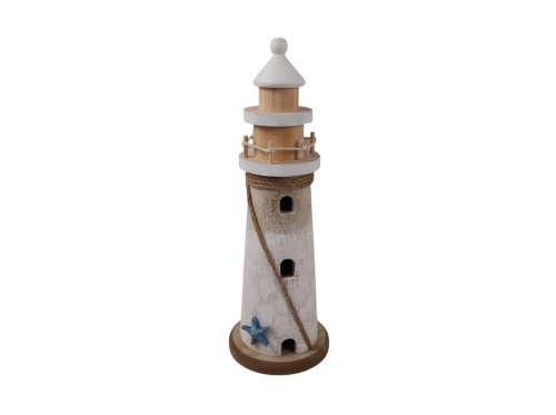 Tento dřevěný maják na postavení v přírodní, bílé a hnědé barvě je ideální pro stolní dekorace či celoroční aranžmá. Rozměry 100 × 300 mm umožňují jeho snadné umístění na parapet, stůl či poličku. Stylový design dodává interiéru útulnou a přírodní atmosféru. Dekorace je praktická a bezpečná, vhodná pro kombinaci s dalšími dekorativními prvky.