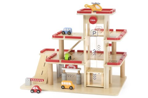 Dřevěná garáž s doplňky. Rozměry garáže 58x37x45,3 cm. Součástí balení 4 autíčka a helikoptéra. Rozměry balení 59x39x9,5 cm. Věk 3+