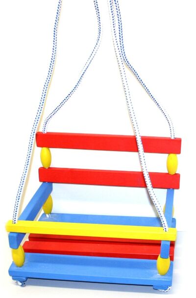 Klasická barevná houpačka ze dřeva se zábranou proti vypadnutí. Nosnost 80kg