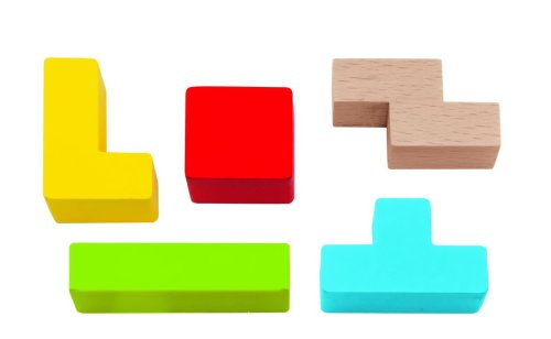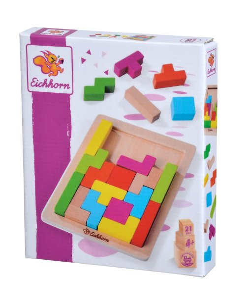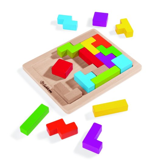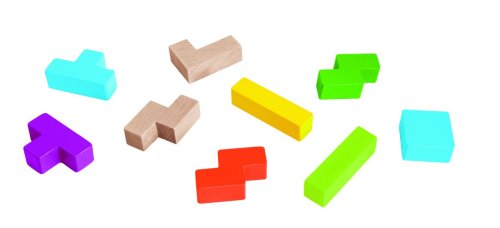 Dovednostní hra pro 1 hráče, 20 ks barevných různě tvarovaných kostek z bukového dřeva na desce z překližky, 5 tvarů kostek, rozměry: 18 x 15 cm.