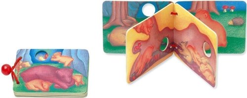 Dřevěná knížka - medvědí příběh - s okýnkem Veselá dřevěná knížka pro naše nejmenší. Knížka je vyrobena z kvalitního materiálu a je lehce omyvatelná. Obrázky jsou přehledné, jednoduché, malované tak, že určitě zaujmou malé čtenáře. Pomáhá nejen seznamovat se životem kolem nás, ale i prohlubovat kontakt s rodiči či ostatními dětmi. Knížka se skládá ze 4 dřevěných listů s 8mi pěknými obrázky. Otvory na jednotlivých stránkách podporují rozvoj jemné motoriky.