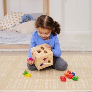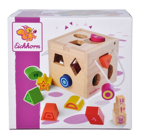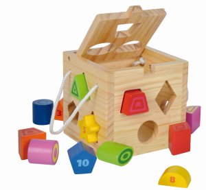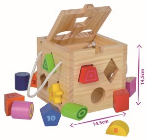 Dřevěná otevírací kostka - vkládačka, 12 různě barevných tvarů na vkládání.