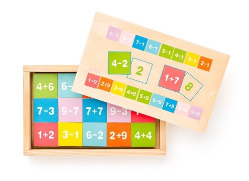 Procvičujte se svými dětmi sčítání a odečítání zábavnou formou. Krabička s příklady obsahuje celkem 81 dílků. Každý dílek má na jedné straně napsaný příklad a na druhé straně je jeho správný výsledek. Tato hračka slouží jako učební pomůcka pro děti z prvních tříd. Vhodná je pro děti od 3 let.