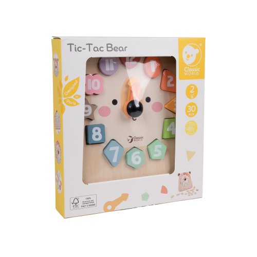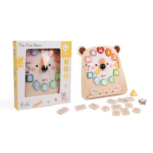 Roztomilé dřevěné hodiny s motivem medvěda pomáhají dětem zábavnou formou naučit se poznávat čas. Barevná vkládačka s čísly rozvíjí jemnou motoriku, logické myšlení i koordinaci ruky a oka. Otáčivé ručičky umožňují jednoduché procvičování hodin, zatímco jednotlivé dílky s čísly lze používat i samostatně při hře nebo počítání. Hračka je vyrobena z kvalitního dřeva a má veselý design, který zaujme každé dítě. Rozměry balení: 26 cm x 29 x 5cm Vhodné pro děti od 24 měsíců.