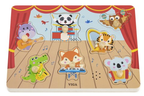 Dřevěná vkládačka zvířátka a hudební nátroje. Napájení na 2xAAA baterie, které nejou součástí balení. Při správném vložení se ozve zvuk daného hudebního nástroje. Rozměry 30x22x1,5 cm. Věk 18m+