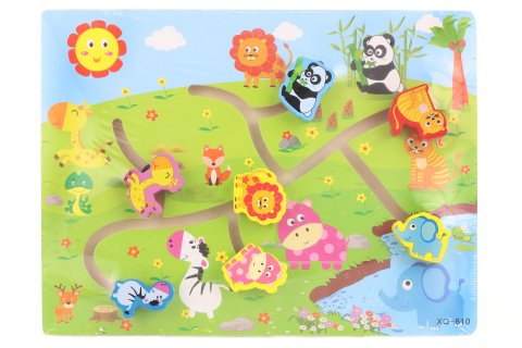Dřevěné bludiště se zvířátky. Rozměry cca 30 x 22,5 x 2,5 cm. Věk 3+