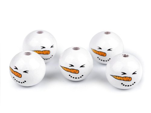 Dřevěné korálky s malovaným obličejem sněhuláka. S jejich pomocí si můžete vytvořit postavičky, vytvořit veselý náhrdelník, vyrobit prstové maňásky, veselé zápichy do květináče apod. Díky malbě se od sebe jednotlivé korálky mohou lišit. Může se lišit i kresba dřeva, včetně barvy. Vzhledem k technologii zpracování dřeva mohou být okolo průvleků otřepky. Obličej je na přední straně korálku, zadní strana je bez malby. Korálky č.1 a 3 se díky laku jemně lesknou, korálky č.2 a 4 jsou přírodní.