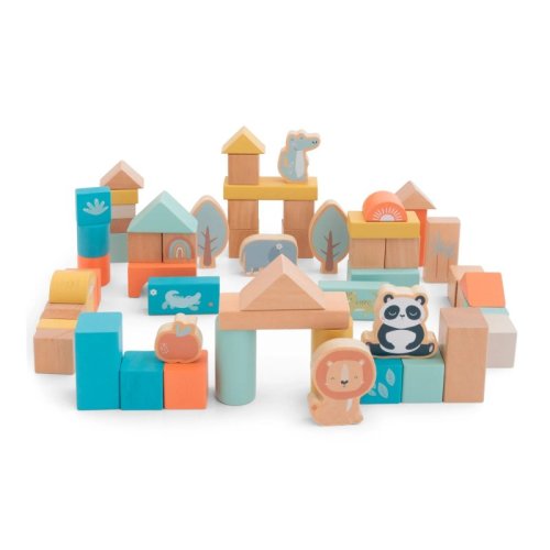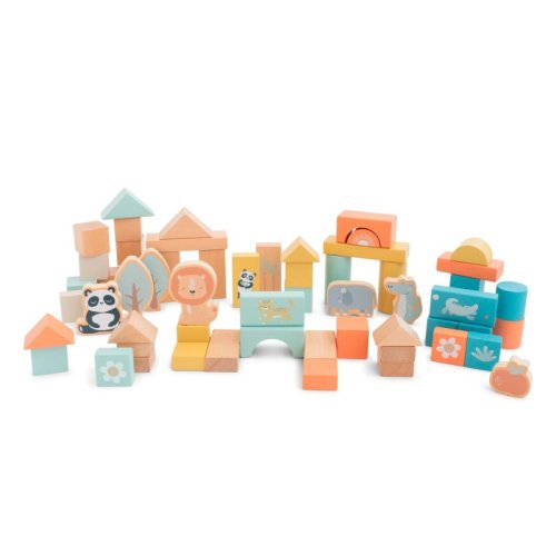 Sada obsahuje 60 dřevěných kostek různých tvarů a barev, ideálních pro rozvoj jemné motoriky a dětské fantazie při stavění domečků, věží nebo jiných abstraktních konstrukcí.