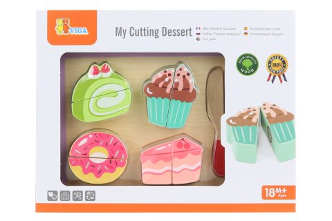 Tato sada na krájení dortu obsahuje 4 lahodné dezerty, které lze nakrájet na 8 částí pomocí dřevěného nože, a tác, který lze převrátit a použít jako prkénko. Dřevěné koláčky drží pohromadě suchým zipem a lze je sladit v odpovídající drážce. Vynikající doplněk každé odpolední čajové soupravy nebo hrací kuchyňky. Rozměr balení cca 27 x 21 x 3,5 cm. Věk 18m+