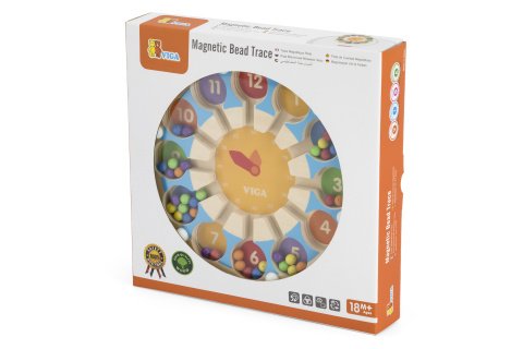 Dřevěná hra - hodiny. pomocí tyčky vkládáte magnetické kuličky na správné pozice. Podporuje učení. Rozměry hodin 17,5x1,5 cm. Rozměry balení 21x21x4 cm. Věk 18m+