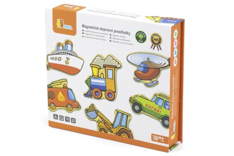 Dřevěné magnety s dopravními prostředky. Baleno v české krabičce. Rozměry balení cca 21 x 19 x 4,5 cm. Věk 18m+
