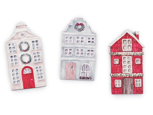 Sada dřevěných mini domečků je vhodná k celoročnímu aranžování. Na přední straně mají potisk, zadní strana je dřevěná. Dají se přilepit na věnec, květináč i truhlík nebo na špejli k vytvoření zápichu. Můžete je také využít na ozdobení přání a dárků. V neposlední řadě mohou být i krásnou vánoční dekorací na stromeček, stačí k nim přilepit šňůrku na zavěšení. Sada obsahuje 3 typy domečků po 4 kusech.