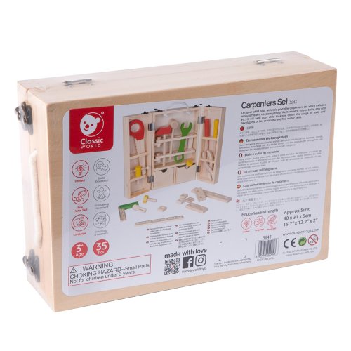 V sadě dřevěného nářadí se nachází sada šroubků, matky, hmoždinky, lišty s otvory k montáži, 2 klíče, šroubováky, kladívka, pravítka a pilka. Dítě může libovolně přikrucovat lišty s pomocí klíče a šroubováku. Všechny díly může spolu spojovat pomocí šroubků. Dětské barevné nářadí je vyrobeno z vysoce kvalitního a bezpečného materiálu.