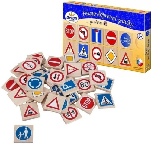 Zábavné poznávání obrázků dopravních značek. Napomůže zdokonalovat znalost dopravních značek a zároveň, si zahrát pexeso. Velikost dřevěných kartiček 165x125x15mm. Balení obsahuje 36 dílků.