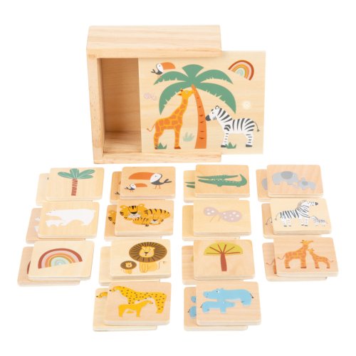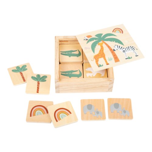 Safari přímo v dětském pokojíku! Abyste našli všech 14 dvojic obrázků budete potřebovat dobrou paměť a soustředěnost. Malé dřevěné dílky s krásnými ilustracemi safari v trendy barvách upoutají pozornost každého dítěte. Budou se chtít dozvědět více o tomto zvířecím světe. Nejen, že si děti při hraní pexesa procvičí paměť, ale také se naučí pojmenovat nová zvířata. Pexeso je uloženo v dřevěném boxu, takže je perfektní i na cesty. Rozměry: krabička 12 x 12 x 5 cm Herní dílek: 5 x 5 x 0,5 cm Věk: 3+ Materiál: dřevo