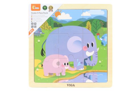 Dřevěné puzzle 9 dílků s obrázkem slonů. Rozměr dřevěné desky cca 22 x 22 x 1 cm. Rozměr balení cca 22 x 22 x 1 cm. Věk 18m+