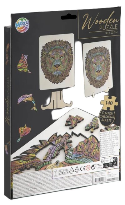 Úžasné puzzle s jedinečnými dřevěnými dílky o velikosti 30x22 cm, každý dílek je unikátní a je ve tvaru různých zvířátek, dílky se skládají do destičky, po složení vznikne z malých zvířátek/dílků obraz jednoho velkého, součástí balení je také praktický stojánek, aby bylo možné dokončenou skládačku patřičně vystavit. Zábava pro děti i dospělé.