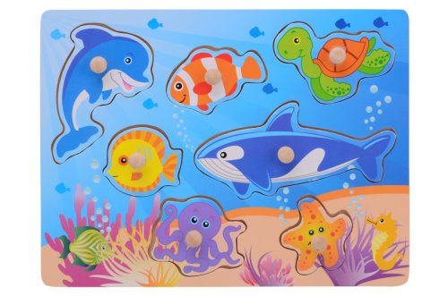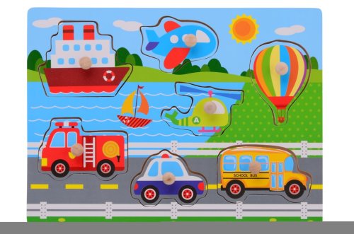 Dřevěné puzzle s úchytem pro nejmenší. 3 různé druhy – ve vodě, na farmě a doprava. Velikost obrázků 30×22 cm.