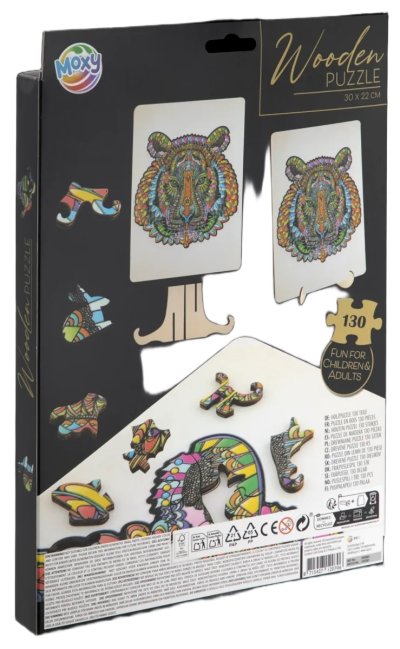 Úžasné puzzle s jedinečnými dřevěnými dílky o velikosti 30x22 cm, každý dílek je unikátní a je ve tvaru různých zvířátek, dílky se skládají do destičky, po složení vznikne z malých zvířátek/dílků obraz jednoho velkého, součástí balení je také praktický stojánek, aby bylo možné dokončenou skládačku patřičně vystavit. Zábava pro děti i dospělé.