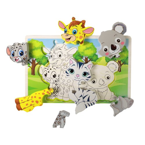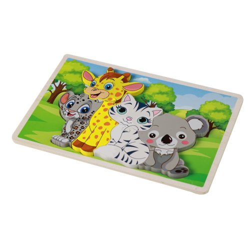 Dřevěné puzzle s motivem zvířátek pro naše nejmenší děti. Skládačka je vyrobena ze dřeva a obsahuje 8 dílků. Pestré barvy a veselá ilustrace podporují rozvoj fantazie, skládání procvičuje motorické vlastnosti a rozvíjí představivost.