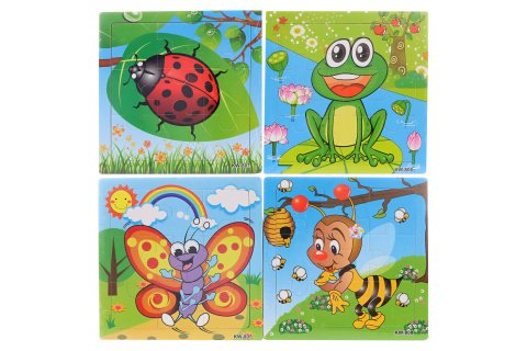 Dřevěné puzzle 9 dílků s motivem zvířátek. Rozměry 15x15 (s vkládací deskou. 4 druhy - dodáváme dle skladové dostupnosti. Věk 3+