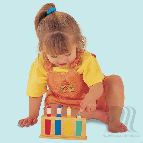 Zábavná dřevěná dětská hračka obsahuje 4 kolíčky (figurky), které díky pružince po zatlačení vyskočí. Vhodné pro zdokonalení zrakové a hmatové koordinace a vnímání kombinace barev. Vhodné pro děti od 12 měsíců.