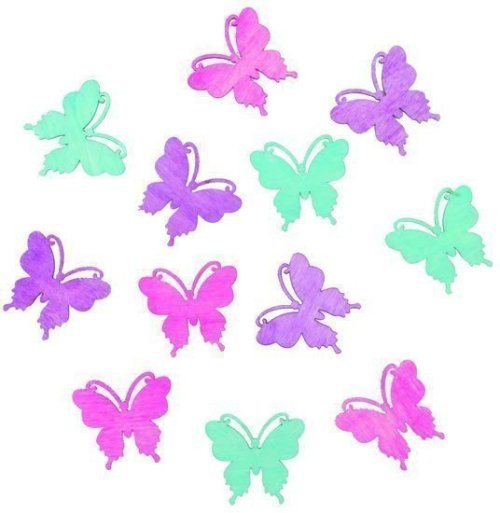 Dřevění motýlci v odstínech růžové, fialové a modré jsou určeni k vytváření dekorací.