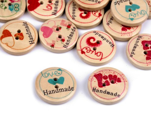 Dřevěné dekorační knoflíky s nápisem "Handmade" vyniknou na ručních výrobcích, dárcích a různých dekoracích. Můžete je použít také ve scrapbookingu. Motiv je jednostranný.