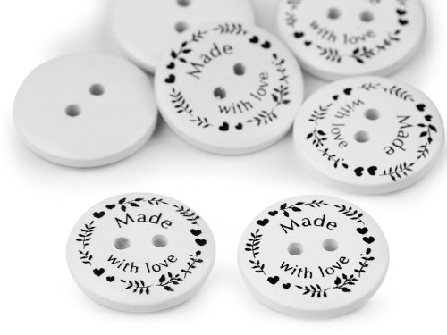 Dřevěné dekorační knoflíky zdobí nápis "Made with love" [a "Handmade with love".] Vyniknou na ručních výrobcích, dárcích a různých dekoracích. Můžete je použít také ve scrapbookingu. Motiv je jednostranný.