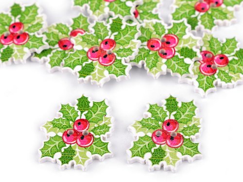 Dřevěný dekorační knoflík vánoční - zelená sv. cesmína (10 ks)