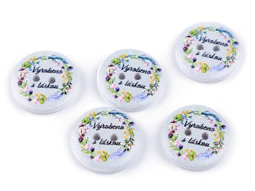 Dřevěné dekorační knoflíky zdobí květinový potisk a nápis "Vyrobeno s láskou". Vyniknou na ručních výrobcích, dárcích a různých dekoracích. Můžete je použít také ve scrapbookingu. Motiv je jednostranný.
