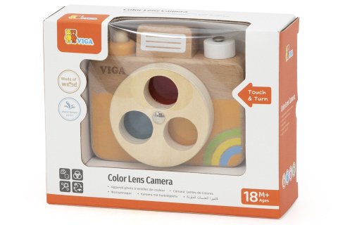 Barevný fotoaparát přináší dětem pohlcující zážitek z hraní na fantasy. Díky otočné čočce a červeným, žlutým a modrým filtrům mohou děti přepínat pohledy a prozkoumávat barevný svět. Realistické tlačítko spouště, otočný horní knoflík a zadní zrcátko dohromady přispívají k hravé interakci. Fotoaparát je vyroben z odolného bukového dřeva s hladkými zaoblenými rohy, je bezpečný a ideální pro malé ručičky. Rozměry balení 15x12x5 cm. Rozměry fotoaparátku 10x4,2x8,8 cm. Věk 18m+