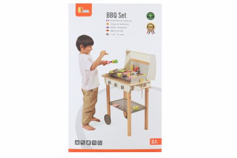 Dřevěný gril s doplňky. Balení obsahuje gril o velikosti cca 88,4 x 67,8 x 38,6 cm, jídlo, náčinní ke grilu a další doplňky. Rozměry balení cca 41 x 64,5 x 11 cm. Věk 3+
