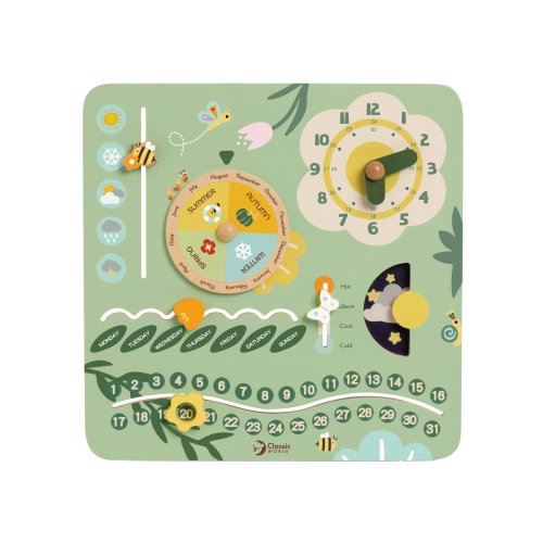 Stylový dřevěný kalendář v anglickém jazyce je skvělým pomocníkem pro výuku času, ročních období, dnů v týdnu i základních anglických slovíček. Děti si mohou každý den samy nastavit datum, měsíc, počasí nebo den v týdnu pomocí otočných a posuvných prvků. Barevné provedení je přehledné a zábavné, ideální pro domácí učení i do školky. Hračka rozvíjí slovní zásobu, orientaci v čase i samostatnost. Velikost balení: 31 cm x 31 cm x 5cm. Vhodné pro děti od 3 let.