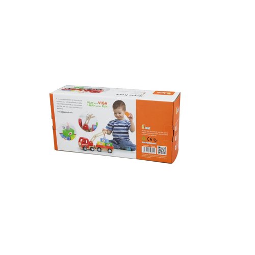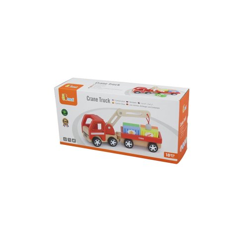 Sada se skládá z auta s otočným jeřábem a magnetem, odnímatelného přívěsu a čtyř tematických nádob (ovoce, chléb, zelenina, ryby) s magnety, které umožní vašemu batoleti nakládat a vykládat dopravní prostředky. Celá sada je vyrobena z bukového dřeva natřeného nezávadnými barvami .
