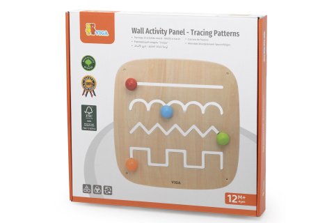 Dřevěný nástěnný panel s výukou kreslení základních linií. Rozměry panelu 40x40x5,2 cm. Baleno v krabici. Rozměry balení 41x41x6 cm. Věk 12m+