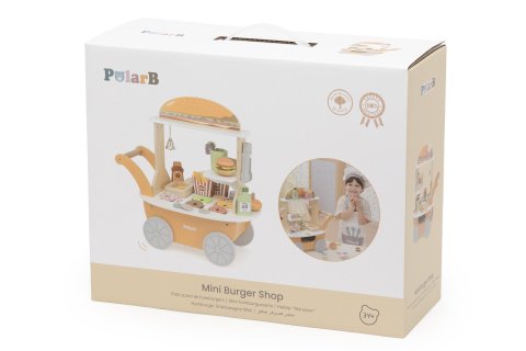 Dřevěný stánek s rychlým občerstvením. Balení obsahuje stánek a 46 kusů příslušenství, jako např. hamburgerové bulky, hranolky, zeleninu, maso nebo sýr. Balení také obsahuje dřevěné mince. Rozměry stánku 43,8x45x2,6 cm. Rozměry balení 41x34x16 cm. Věk 3+
