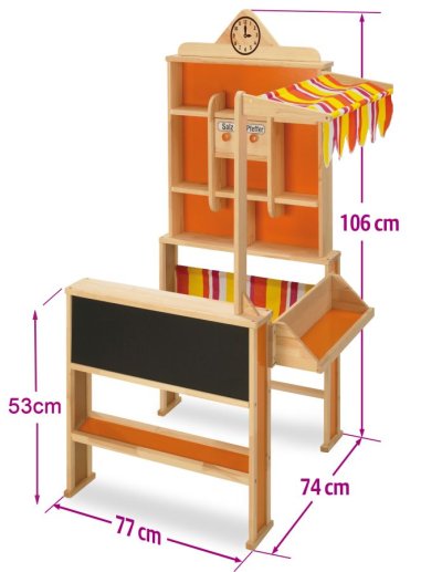 Dřevěný obchod s pultem, stánkem na ovoce a zeleninu. Nechybí ani police na další zboží. BEZ PŘÍSLUŠENSTVÍ. Rozměry: 77x74x106 cm.