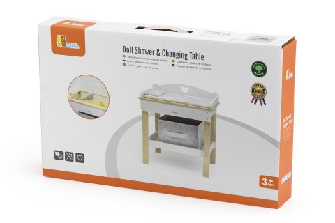 Dřevěný přebalovací pult s vaničkou pro miminko. Balení obsahuje pultík, vaničku, sprchu, kačenku a látkový košík na drobnosti. Rozměry balení cca 51x32x8,5 cm. Rozměry pultíku 50x30x54,5 cm. Věk 3+
