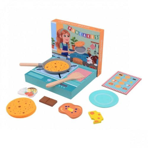 sada obsahuje 4 palačinky (PES) a dřevěné příslušenství - servírovací tác, prostírání, pánvičku, obracečku, různé pochutiny aj.