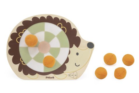 Dřevěný terč s motivem ježka. Terč lze postavit pomocí stojánku umístěného na zadná straně.. Balení obsahuje 6 látkových míčků. Rozměry terče 30x7,5x20,5 cm. Baleno v krabici. Věk 3+