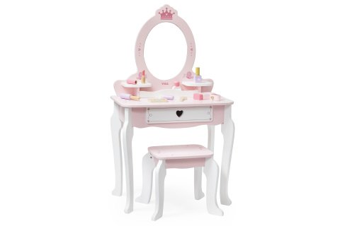 Dřevěný toaletní stolek v růžové princeznovské barvě. Součástí drobné doplňky jako např.fén, hřebínek nebo lak na nehty. Velikost tolku 95,5x55x30 cm. Rozměry balení 62x51x19 cm. Věk 3+