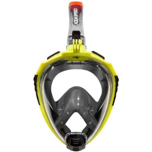 Maska do vody Aqua-Speed Drift nabízí zcela nový pohled na podvodní svět. Celoobličejová maska vám rozšíří obzory při šnorchlování v malých hloubkách (při sestupu do větších hloubek je nutné vyrovnávat tlak v uších, což není v masce z důvodu nedostatečného přístupu k nosu možné). Pevná polykarbonátová maska je má dvojité silikonové těsnění a díky své konstrukci nabízí široké zorné pole 180°. K dokonalému usazení slouží dva délkově nastavitelné elastické pásky. Šnorchl lze snadno složit, což umožňuje snazší přepravu i uskladnění. Součástí masky je i držák pro kameru (kamera není součástí balení). Jak zvolit správnou velikost potápěčské masky Aqua-Speed? Pokud nemáte možnost vyzkoušet si masku před zakoupením, použijte následující metodu k měření velikosti obličeje: Zavřete ústa a změřte vzdálenost mezi okrajem brady a obočím. Je-li vzdálenost menší než 14 cm, zvolte velikost S/M. Je-li vzdálenost větší, zvolte velikost L/XL.