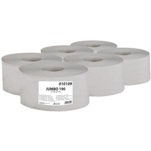 Jednovrstvý Jumbo toaletní papír vyrobený z recyklu Výška role 9,5 cm Průměr role 19 cm Návin role 120 m Bez perforace Průměr dutinky 6 cm Balení obsahuje 6 rolí