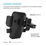 Držák je kompatibilní s telefony o šířce 5,3 až 8,3 cm. Díky rychloupínacímu systému Push and grip uchytíte telefon do držáku jednou rukou. Jen mobil lehce přitisknete na plochu držáku. Boční kleště se samy přizpůsobí vašemu telefonu. Jediným stiskem ho zase uvolníte. Mechanismus je tichý a plynulý.