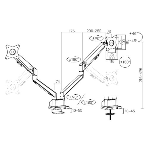 Hlavní vlastnosti: • Flexibilní nastavení polohy: Držák umožňuje snadné nastavení výšky, nastavitelný náklon monitoru v úhlu +/- 45°, vychýlení do stran o 180° a otočení monitoru o 360°, takže můžete snadno najít optimální pozici pro pohodlné a ergonomické používání. Odnímatelná deska VESA umožňuje snadnou instalaci monitoru. • Vestavěný mechanismus s plynovými vzpěrami umožňuje dokonalé nastavení tuhosti ramen dle hmotnosti monitorů. • Univerzální kompatibilita: Tento stolní držák je kompatibilní s většinou monitorů o velikosti od 17" do 32" palců a s VESA standardy 75x75mm a 100x100mm. Nezáleží na tom, zda používáte LCD, LED nebo OLED monitor, držák monitoru Brateck poskytne bezpečné a stabilní uchycení. • Vestavěný systém průchodek pro usnadnění organizace vedení kabelů. • Odolná konstrukce: Držák je vyroben z vysoce kvalitního materiálu, který zajišťuje stabilitu a odolnost. • Snadná instalace: Držák je dodávám s kompletním montážním příslušenstvím, díky němuž je možné ho snadno namontovat na stůl během několika minut. Snadná montáž pomocí svorky na desky o tloušťce 10-50 mm nebo pomocí průchodky na desky o tloušťce 10-45 mm.