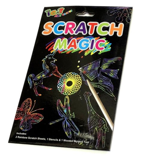 Sada obsahující dva škrabací nepotištěné listy pro volné tvoření, papírovou šablonku a dřevěný škrabací stylus. Škrabací obrázky probouzí kreativitu a nadšení a nejen malé výtvarníky zaměstnají na dlouhé hodiny. Papír je potažený černou vrstvou skrývající podklad s duhovým efektem. Obsah balení: * 2 obrázky s barevnou vrstvou (rozměry 15,5 x 11,5 cm) * 1 arch s šablonami * dřevěné škrabací pero Variantu šablonek dodáváme dle skladových zásob.