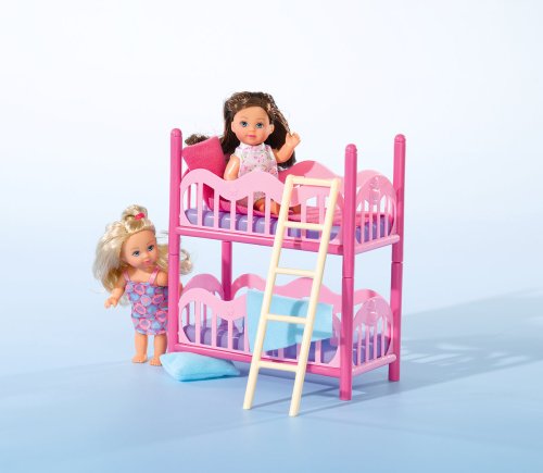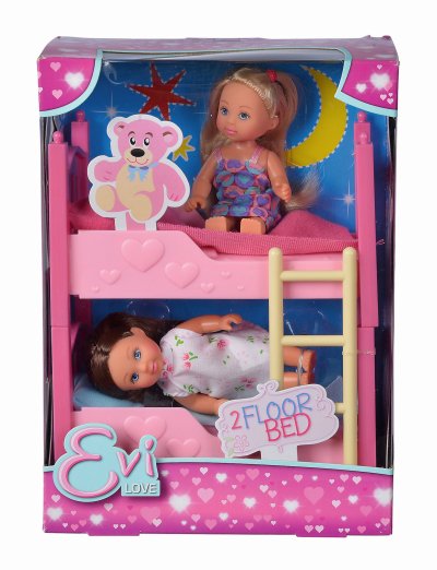 Panenky Evičky v pyžamu s palandou. Palanda lze rozložit na dvě postýlky. Součástí 2 polštáře a 2 deky. Výška panenky 12 cm.